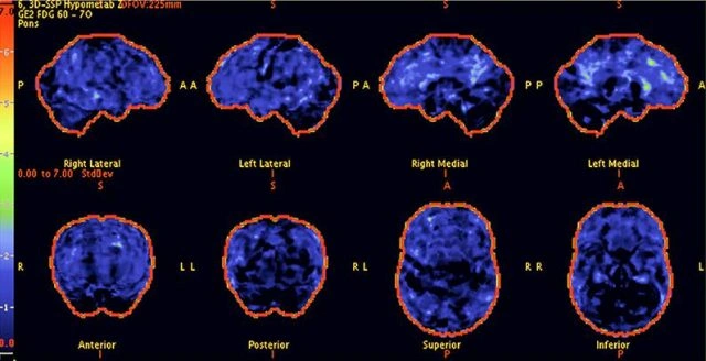 Above: The patient's PET scan after CureFight treatment shows improvement, with cognitive abilities greatly enhanced as the scan approaches that of a normal brain.