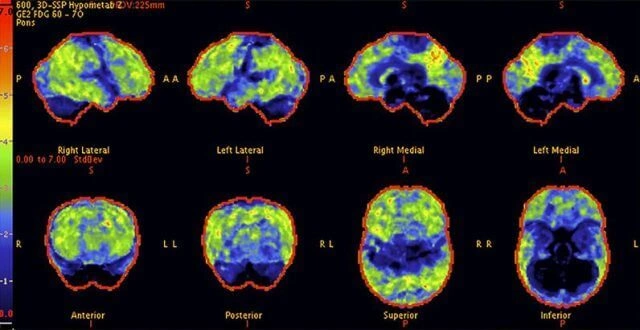 Above: A 68-year-old woman with a 10-year history of cognitive issues. Previous PET scans showed significant metabolic decline, indicating Alzheimer's.
